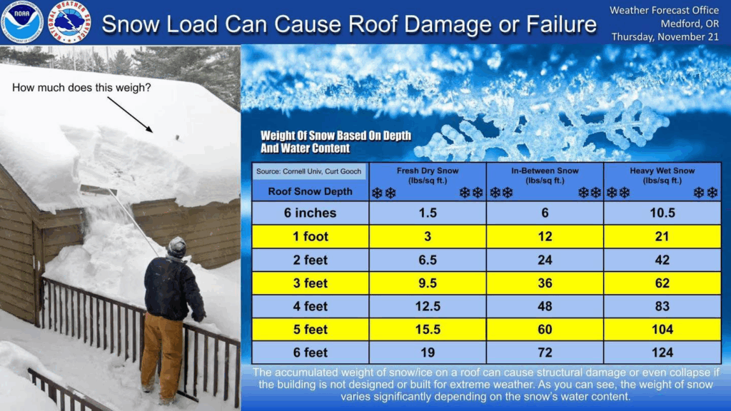- Wet, Heavy Snow: Wet, dense snow can weigh as much as 20 pounds per cubic foot or more. If a large amount of heavy snow accumulates on your roof, it can quickly exceed the load-bearing capacity of the structure, leading to damage or collapse.